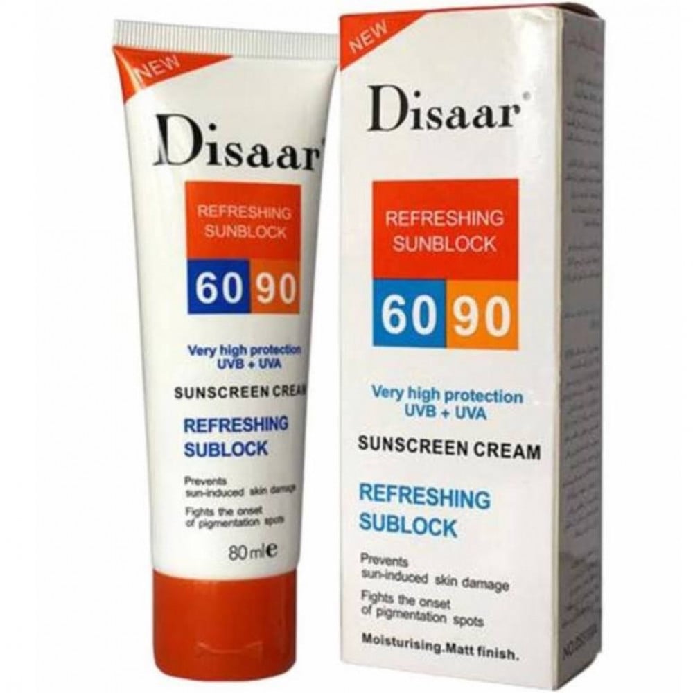 كريم الحماية من الشمس ديسار وبعامل حماية 90 شفاف ( Disaar )- 80 مل, ليس له تأثير دهني يحمي من أضرار أشعة الشمس والشيخوخة المبكرة عن طريق حجب الأشعة فوق البنفسجية, مرطب يضمن حماية مثالية من الأشعة فوق البنفسجية الطويلة والمتوسطة ويوفر الحماية من الآثار الضارة لأشعة الشمس كحروق الشمس أو الحساسية المفرطة لأشعة الشمس أو ما إلى ذلك, كما ينشط الحماية الطبيعية بالجلد ويحمي من تلف خلايا البشرة.